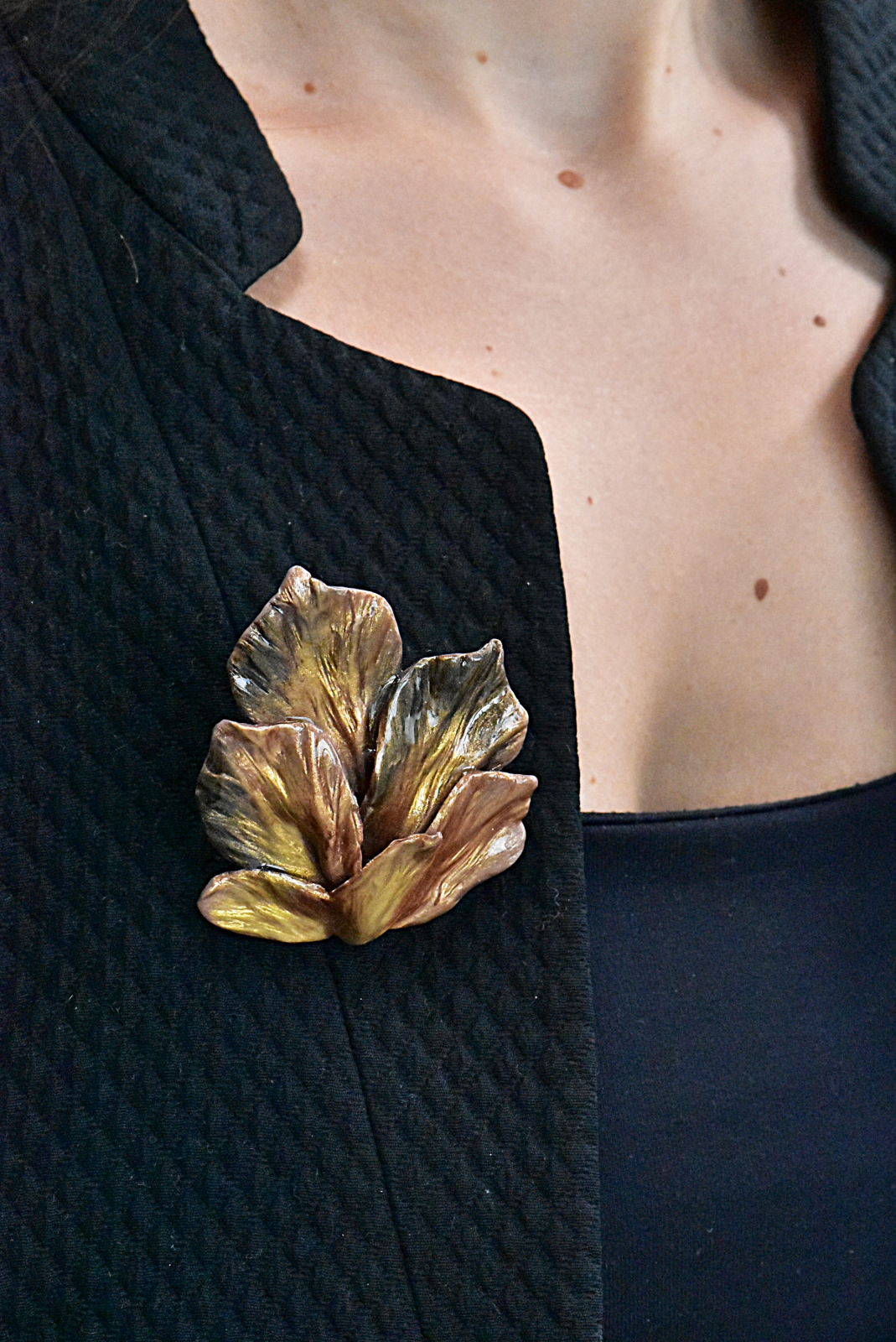 Broșele din lut polimeric și rășină epoxidică, lucrate manual, sunt bijuterii unice care îmbină arta și eleganța într-o formă compactă. Fiecare broșă este realizată cu atenție la detalii, modelată din lut polimeric pentru a crea forme și motive distinctive, de la flori stilizate la modele abstracte. Stratul de rășină epoxidică adaugă o strălucire clară și protejează designul, oferindu-i durabilitate și un finisaj rafinat.